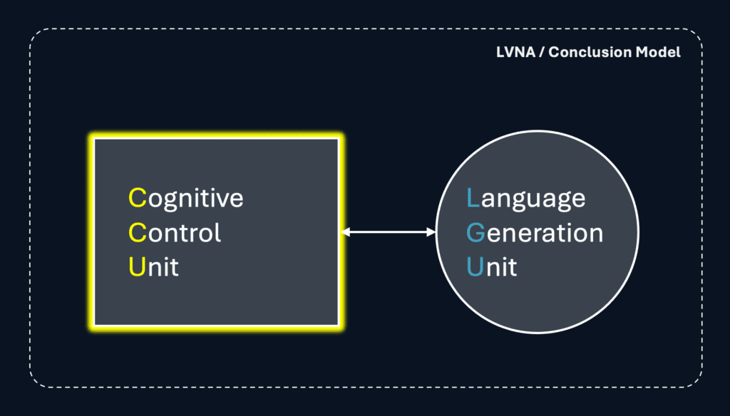 LVNA besteht, stark abstrahiert, als zwei zentralen Funktionsblöcken: einem Sprach-Generator sowie einer funktionalen Steuerungs-Einheit. Zusammen bilden sie den architekturell verankerten kognitiven Kern.