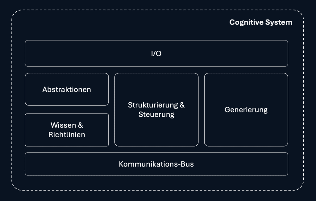 In Kognitiven Systemen entsteht die Intelligenz nicht aus einzelnen Funktionen, sondern aus dem strukturierten und gerichteten Zusammenwirken all dieser Blöcke.
